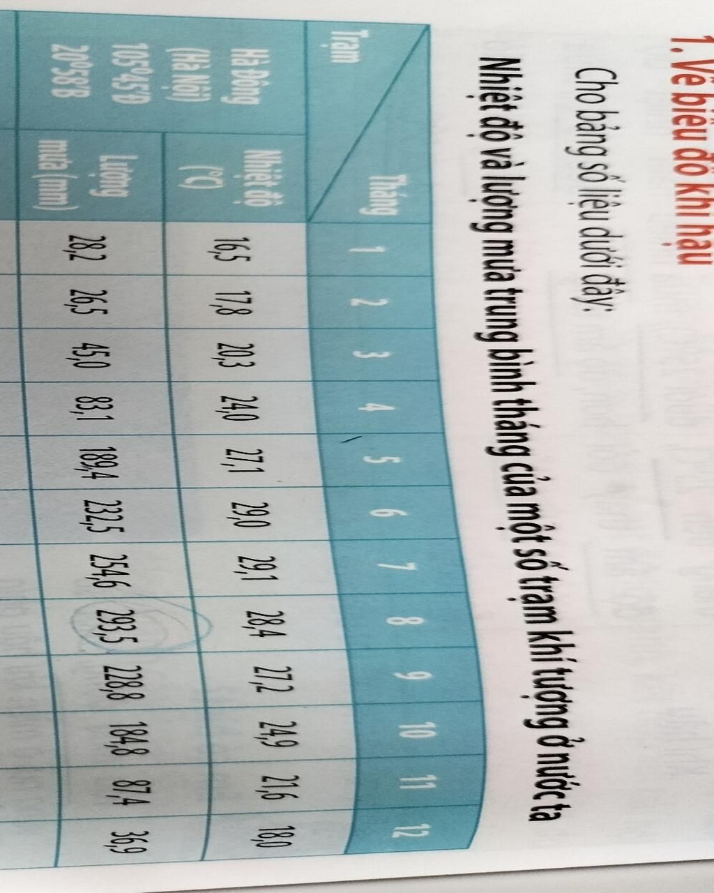Vẽ biểu đồ khí hậu thể hiện nhiệt độ và lượng mưa của Hà Đông Hà Nội. Được cho trong bảng sau