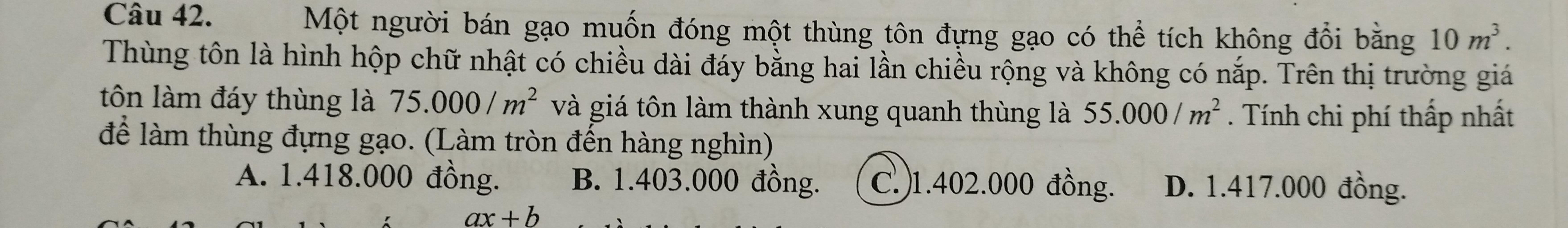 Vậy chi phí thấp nhất để làm thùng đựng gạo là $1,402,000$ đồng