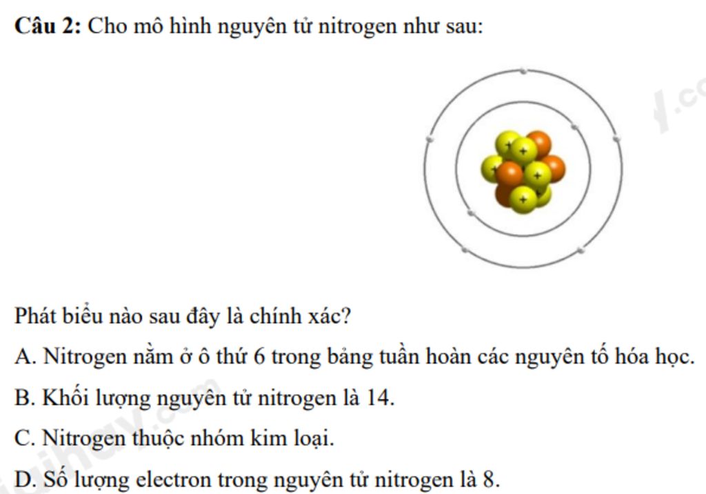 Câu `2:` Cho mô hình nguyên tử nitrogen như sau: Phát biểu nào sau đây là chính xác?