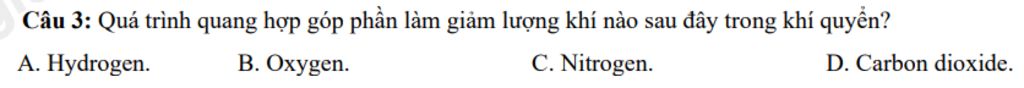 Câu 3: Quá trình quang hợp góp phần làm giảm lượng khí nào sau đây trong khí quyển?