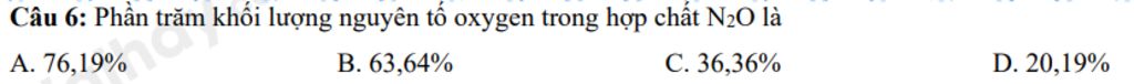 `%O` trong hợp chất `N_2 O` là `:(16)/(14.2+16).100~~36,36%`