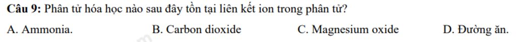Câu `9:` Phân tử hóa học nào sau đây tồn tại liên kết ion trong phân tử?