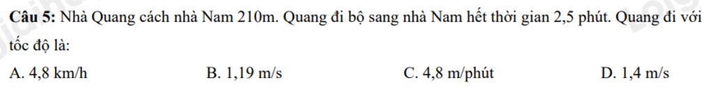Câu 5: Nhà Quang cách nhà Nam 210m. Quang đi bộ sang nhà Nam hết thời gian 2,5 phút. Quang đi với tốc độ là: