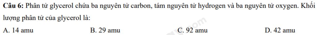 Câu 6: Phân tử glycerol chứa ba nguyên tử carbon, tám nguyên tử hydrogen và ba nguyên tử oxygen. Khối lượng phân tử của glycerol là: