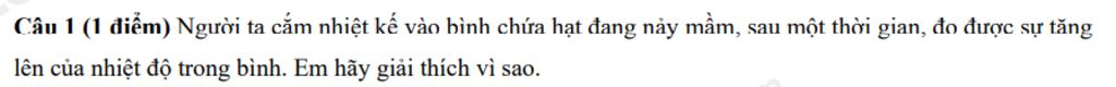 Người ta cắm nhiệt kế vào bình chứa hạt đang nảy mầm, sau một thời gian ta đo được sự tăng lên của nhiệt độ trung bình là do khi hạt đang nảy mầm, quá trình hô hấp tế bào mạnh sinh ra nhiều nhiệt năng. Chính nhiệt năng mà hạt mầm giải phóng ra mà nhiệt độ trung bình của hạt mầm tăng lên