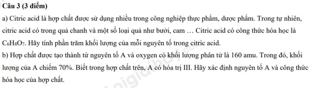 b) Hợp chất được tạo thành từ nguyên tố A và oxygen có khối lượng phân tử là 160 amu. Trong đó, khối lượng của A chiếm 70%. Biết trong hợp chất trên, A có hóa trị III. Hãy xác định nguyên tố A và công thức hóa học của hợp chất.
