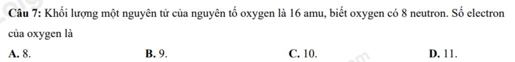 Câu `7:` Khối lượng một nguyên tử của nguyên tố $oxygen$ là $16 amu$, biết $oxygen$ có $8 neutron$. Số $electron$ của $oxyge$n là