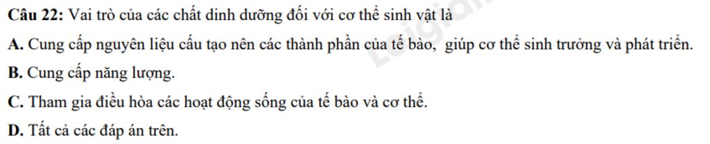 Câu 22: Vai trò của các chất dinh dưỡng đối với cơ thể sinh vật là