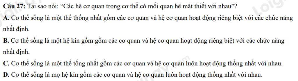 Câu 27: Tại sao nói: “Các hệ cơ quan trong cơ thể có mối quan hệ mật thiết với nhau”?