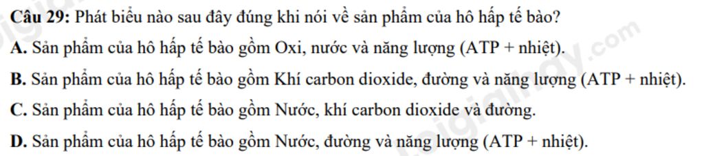 Câu `29:` Phát biểu nào sau đây đúng khi nói về sản phẩm của hô hấp tế bào?