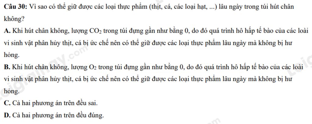 Câu 30: Vì sao có thể giữ được các loại thực phẩm (thịt, cá, các loại hạt, ...) lâu ngày trong túi hút chân không?