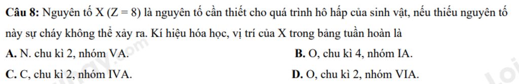 Câu `8:` Nguyên tố `X (Z = 8)` là nguyên tố cần thiết cho quá trình hô hấp của sinh vật, nếu thiếu nguyên tố này sự cháy không thể xảy ra. Kí hiệu hóa học, vị trí của `X` trong bảng tuần hoàn là `:`