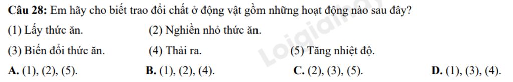 Câu 28: Em hãy cho biết trao đổi chất ở động vật gồm những hoạt động nào sau đây?