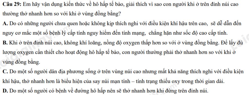 Ở trên đỉnh núi cao, không khí loãng, nồng độ oxygen thấp hơn so với ở vùng đồng bằng. Để lấy đủ lượng oxygen cần thiết cho hoạt động hô hấp tế bào, con người thường phải thở nhanh hơn so với khi ở vùng đồng bằng để lấy đủ lượng oxygen cần thiết cho cơ thể
