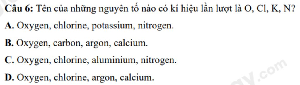 Câu 6: Tên của những nguyên tố nào có kí hiệu lần lượt là O, CI, K, N?