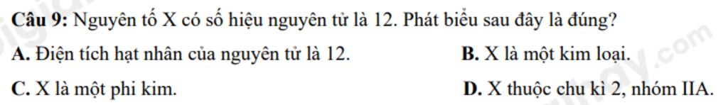 Câu 9: Nguyên tố X có số hiệu nguyên tử là 12. Phát biểu sau đây là đúng?
