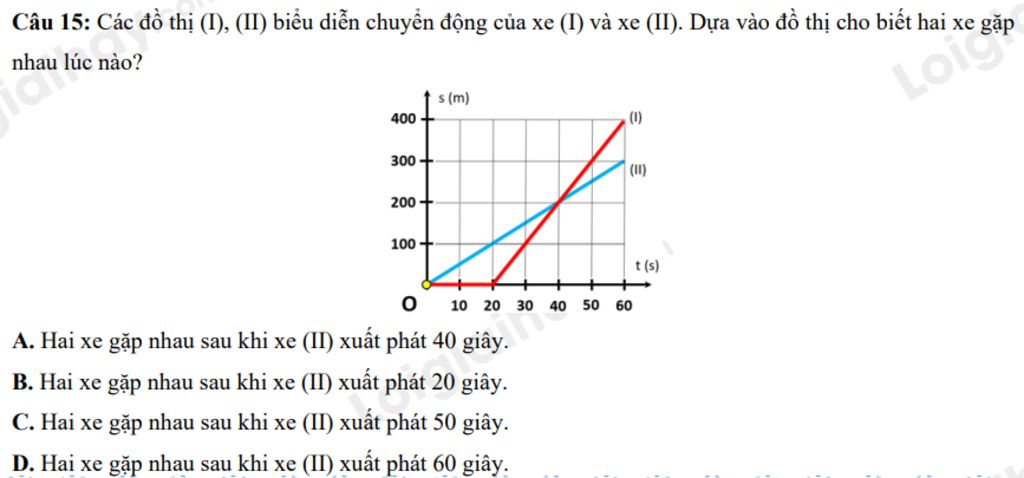 Đáp án đúng là `:` `A.` Hai xe gặp nhau sau khi xe `(II)` xuất phát `40` giây.