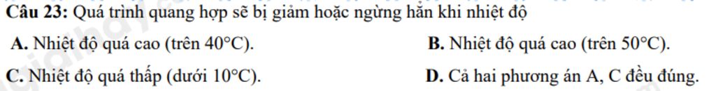 Câu 23: Quá trình quang hợp sẽ bị giảm hoặc ngừng hẳn khi nhiệt độ