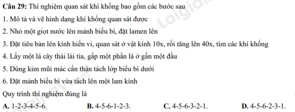 Câu `29:` Thí nghiệm quan sát khí khổng bao gồm các bước sau :