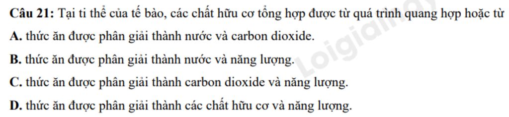 Câu 21: Tại ti thể của tế bào, các chất hữu cơ tổng hợp được từ quá trình quang hợp hoặc từ
