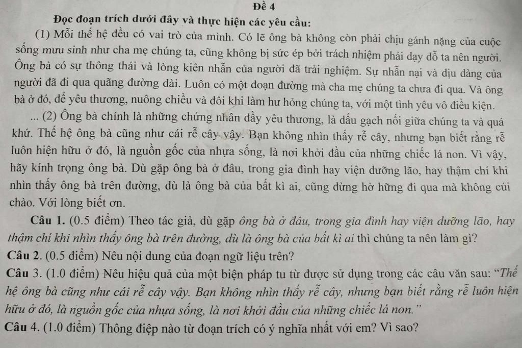Câu 4: Thông điệp có ý nghĩa nhất từ đoạn trích là sự tôn trọng và lòng biết ơn đối với ông bà. Điều này được thể hiện qua việc tác giả nhắc nhở chúng ta phải kính trọng và biết ơn ông bà, người đã yêu thương và nuôi dưỡng chúng ta với tình yêu vô điều kiện. Thông điệp này nhấn mạnh tầm quan trọng của gia đình và lòng biết ơn đối với những người đã chăm sóc chúng ta.
