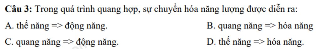 `+` Năng lượng từ ánh sáng mặt trời (quang năng) `->` năng lượng hóa học (hóa năng) tích lũy trong các chất hữu cơ.