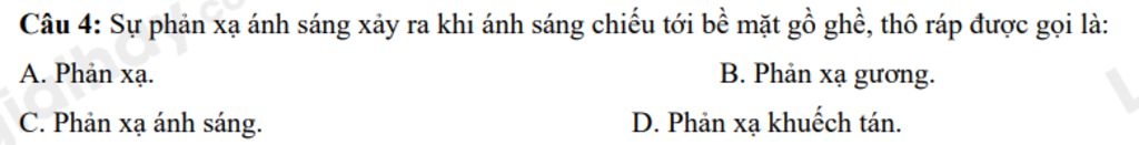 `->`$\text{D}$$\\$ `=>`$\text{Sự phản xạ ánh sáng xảy ra khi ánh sáng chiếu tới bề mặt gồ ghề, thô ráp được gọi $\textit{phản xạ khuếch tán.}$}$$\\$$#hoangnam$