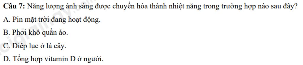 Câu 7: Năng lượng ánh sáng được chuyển hóa thành nhiệt năng trong trường hợp nào sau đây?
