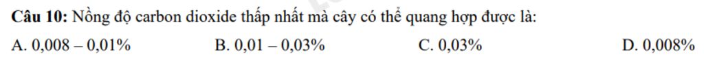 `-` Nồng độ khí carbon dioxide thấp nhất mà cây quang hợp được là từ `0,008%` đến `0,01%`