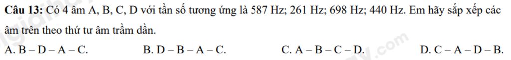 Ta có `: 698 Hz > 587 Hz > 440 Hz > 261 Hz.` Tương ứng với các âm có âm trầm dần là `: C – A – D – B.`