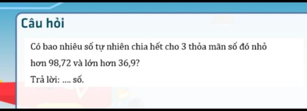 Số tự nhiên chia hết cho 3 mà số đó nhỏ hơn 98,72 và lớn hơn 36,9