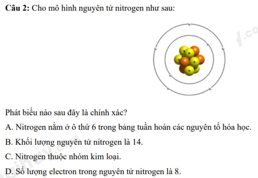 D. Số lượng electron trong nguyên tử nitrogen là 8. (Sai vì trên hình vẽ thì Nitrogen có 7 electron)