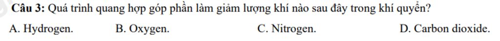 Câu `3. D`. Carbon dioxide