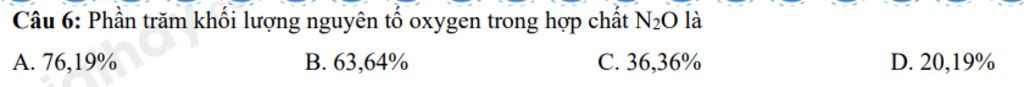 Khối lượng của `N_2O` là`14 .2 + 16 = 44``%O = ` $\dfrac{16}{44}$ `.100% = 36,36%``=> C`