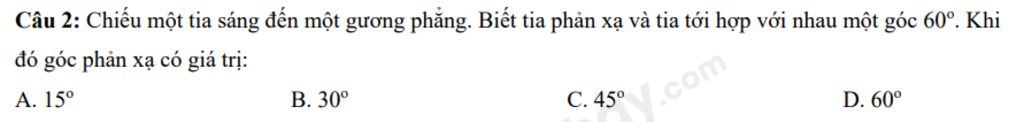 `=>`Góc phản xạ `=` Góc tới `=60^o/2=30^o`