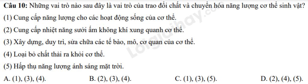 Vai trò của trao đổi chất và chuyển hóa năng lượng: Cung cấp năng lượng cho các hoạt động của cơ thể; Xây dựng, duy trì, sửa chữa các tế bào, mô, cơ quan trong cơ thể; Loại bỏ chất thải khỏi cơ thể