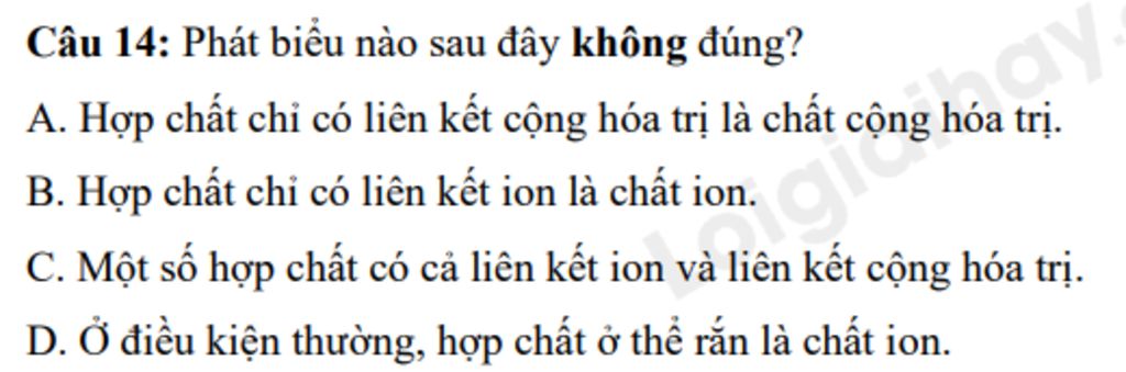 D. Ở điều kiện thường, hợp chất ở thể rắn là chất ion. `->` sai vì đường, paraffin,.. ở thể rắn nhưng là hợp chất cộng hoá trị