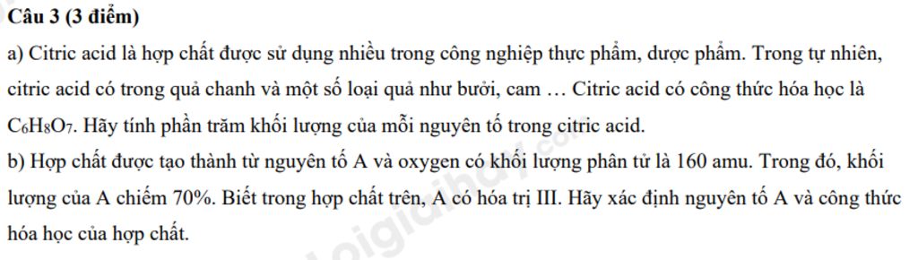 a) Citric acid là hợp chất được sử dụng nhiều trong công nghiệp thực phẩm, dược phẩm. Trong tự nhiên, citric acid có trong quả chanh và một số loại quả như bưởi, cam … Citric acid có công thức hóa học là C6H8O7. Hãy tính phần trăm khối lượng của mỗi nguyên tố trong citric acid.