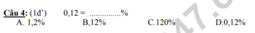 `->` `0,12=12/100=12%` (đọc: mười hai phần trăm)