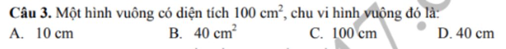 Hình vuông đó có diện tích `100cm^2` nên cạnh của hình vuông đó bằng `10cm`.