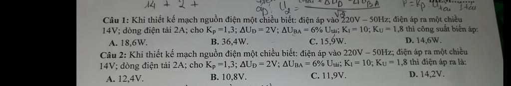 Câu 1: Khi thiết kế mạch nguồn điện một chiều biết: điện áp vào 220V – 50Hz; điện áp ra một chiều