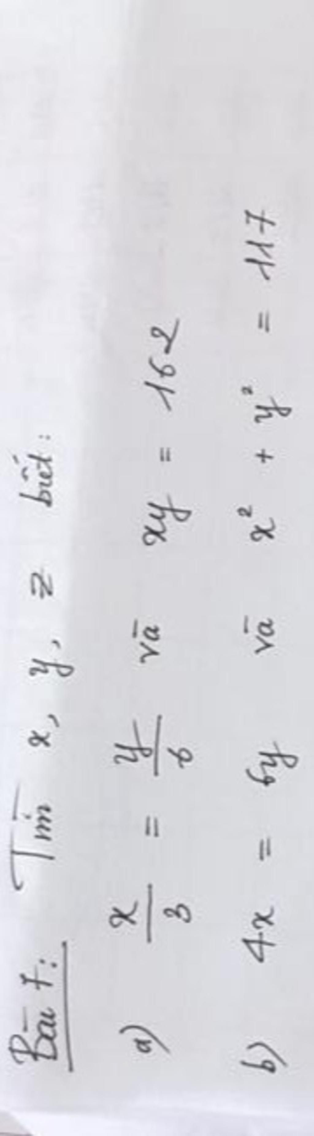 `b)\ 4x=6y` và `x^2 + y^2 = 117`