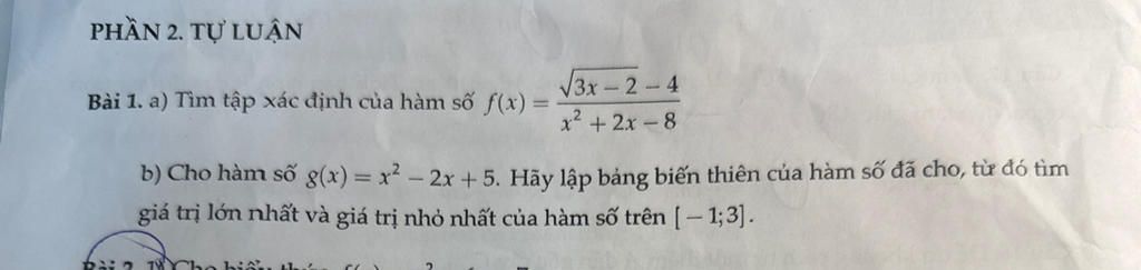 b) Cho hàm số g(x) = r2 – 2x + 5. Hãy lập bảng biến thiên của hàm số đã cho, từ đó tìm
