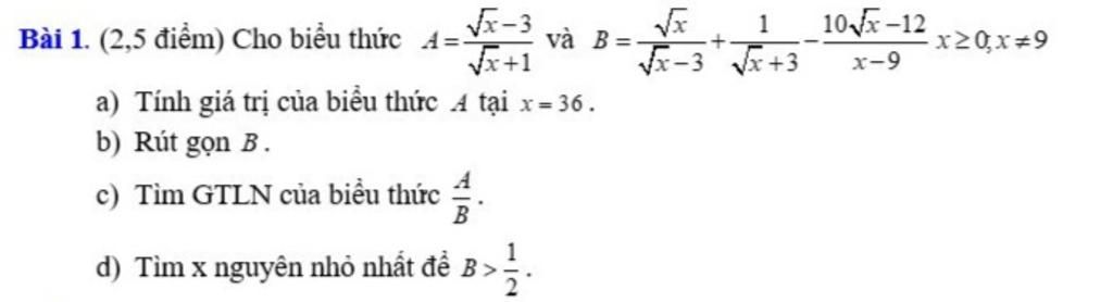 $\frac{A}{B}$ = $\frac{√x-3}{√x+1 }$ :$\frac{√x-3}{√x+3}$ =$\frac{√x-3}{√x+1 }$ . $\frac{√x+3}{√x-3}$ = $\frac{√x+3}{√x+1}$ = $\frac{√x + 1 + 2}{√x + 1}$ = 1 + $\frac{2}{√x+1}$