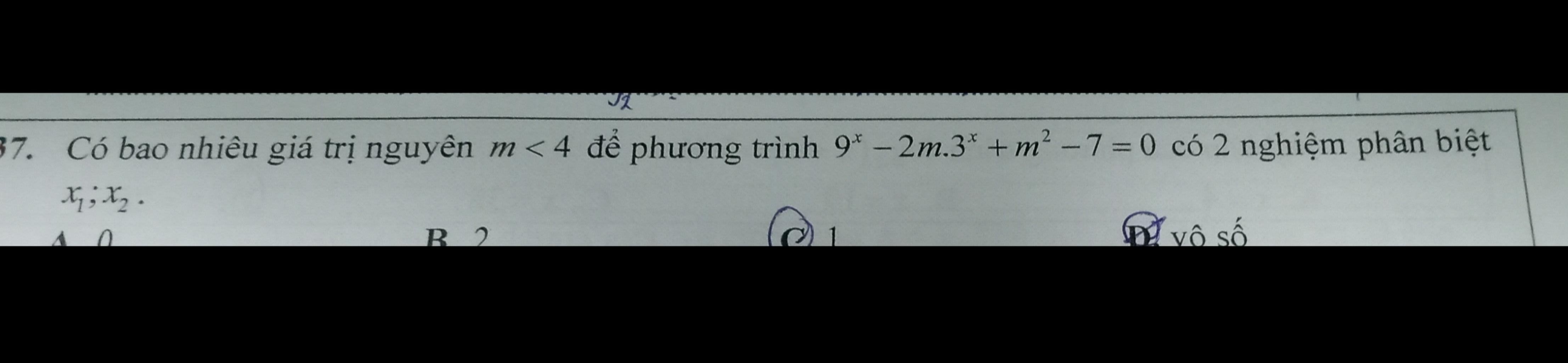 $\begin{array}{l} {9^x} - 2m{3^x} + {m^2} - 7 = 0\\ t = {3^x},PT \Rightarrow {t^2} - 2mt + {m^2} - 7 = 0(1) \end{array}$