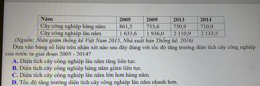 Dựa vào bảng số liệu đã số liệu đã xử lí, nhận xét: "tốc độ tăng trưởng diện tích cây công nghiệp lâu năm nhanh hơn" đúng với tốc độ tăng trưởng diện tích cây công nghiệp của nước ta giai đoạn `2005 - 2014`