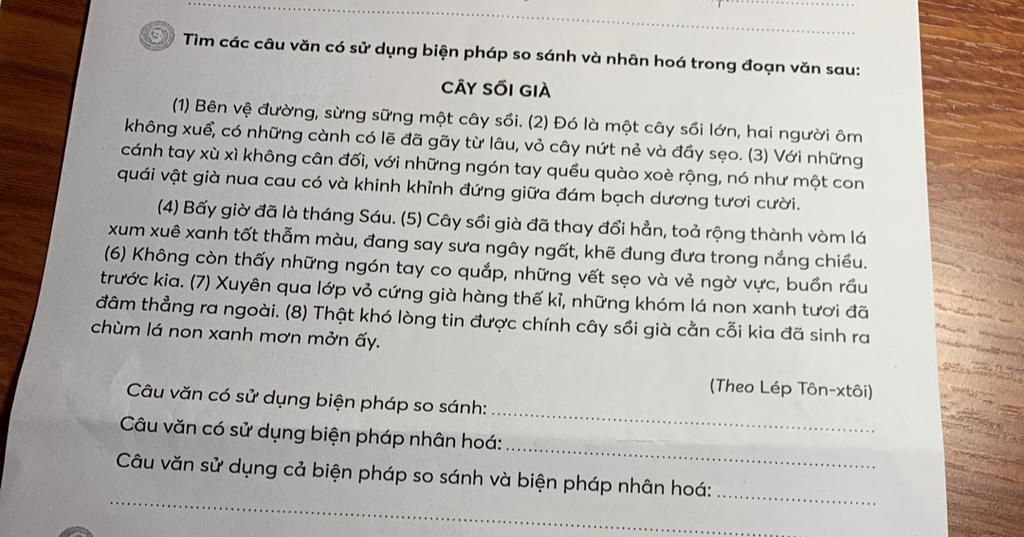 câu 3 : với những cánh tay xù xì không cân đối với những ngón tay quều quào xòe rộng .Được nhân hóa với bộ phận của con người
