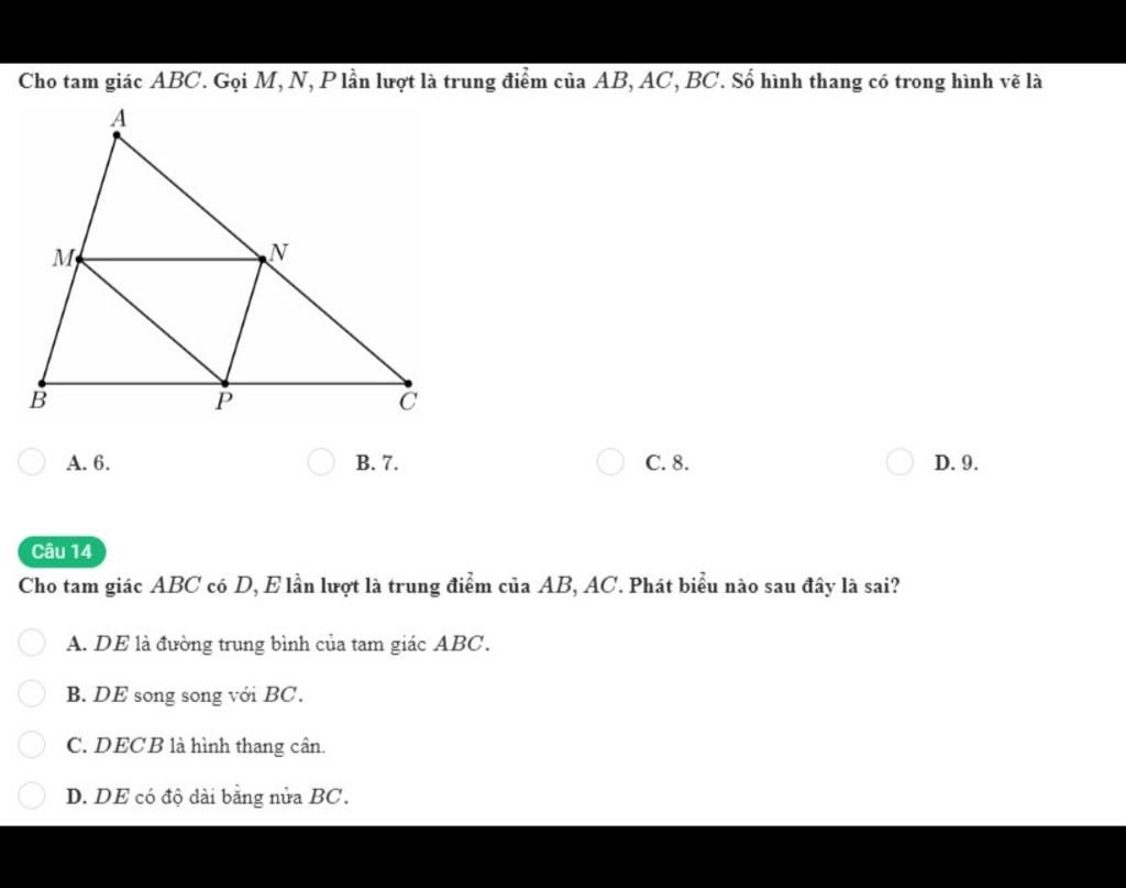 Cho tam giác ABC. Gọi M, N, P lần lượt là trung điểm của AB, AC, BC. Số hình thang có trong hình vẽ là