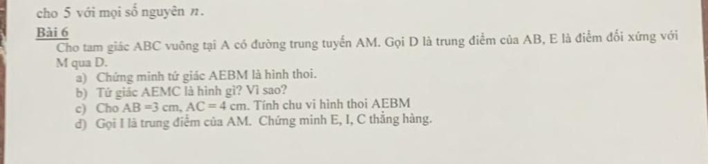 Vì $\Delta ABC$ vuông tại $A,M$ là trung điểm $BC\to MA=MB=MC=\dfrac12BC=\dfrac52$