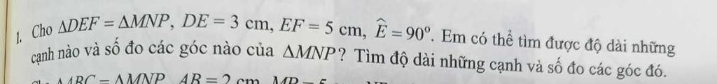 I. Cho ADEF = AMNP, DE = 3 cm, EF = 5 cm, E = 90°. Em có thể tìm được độ dài những